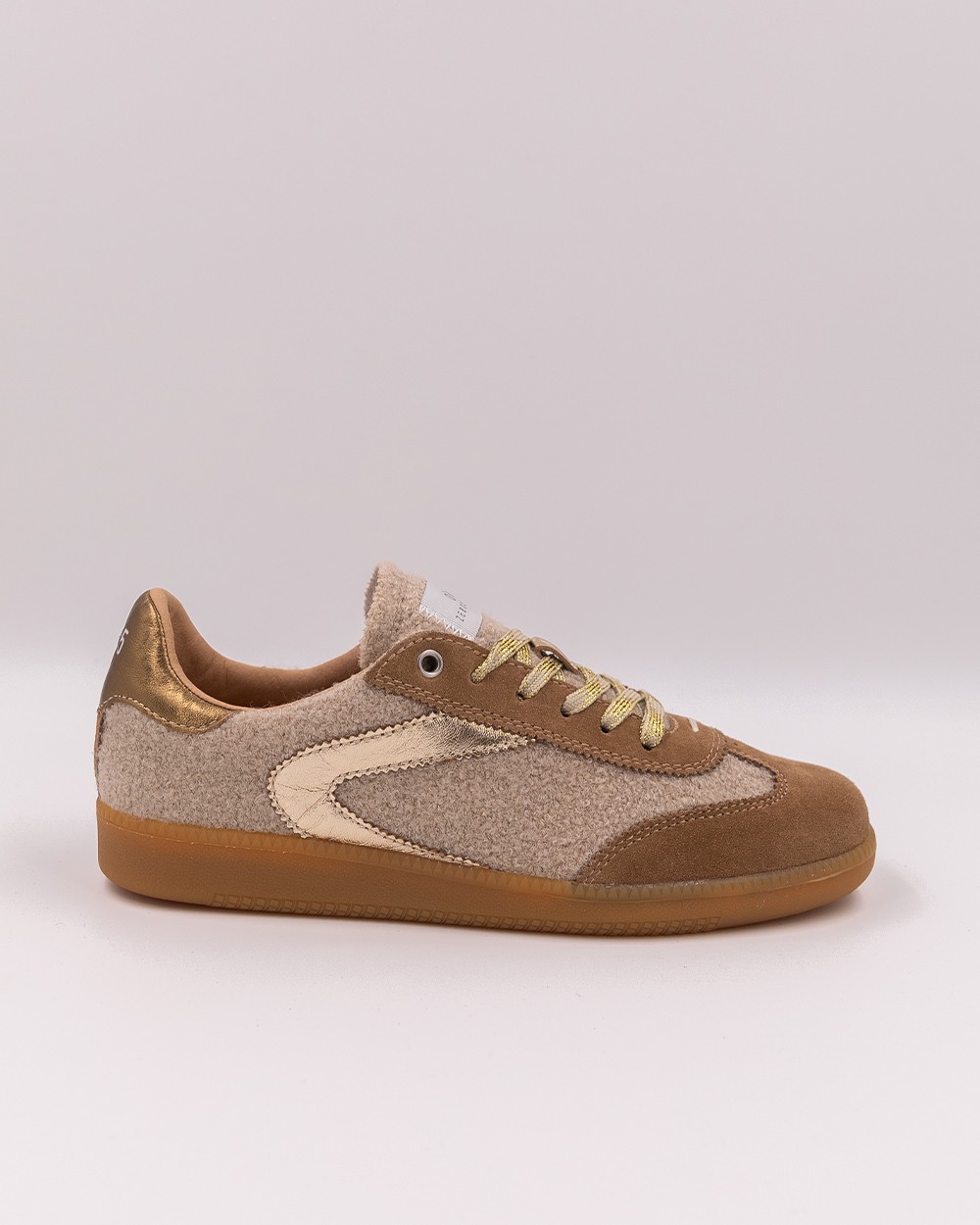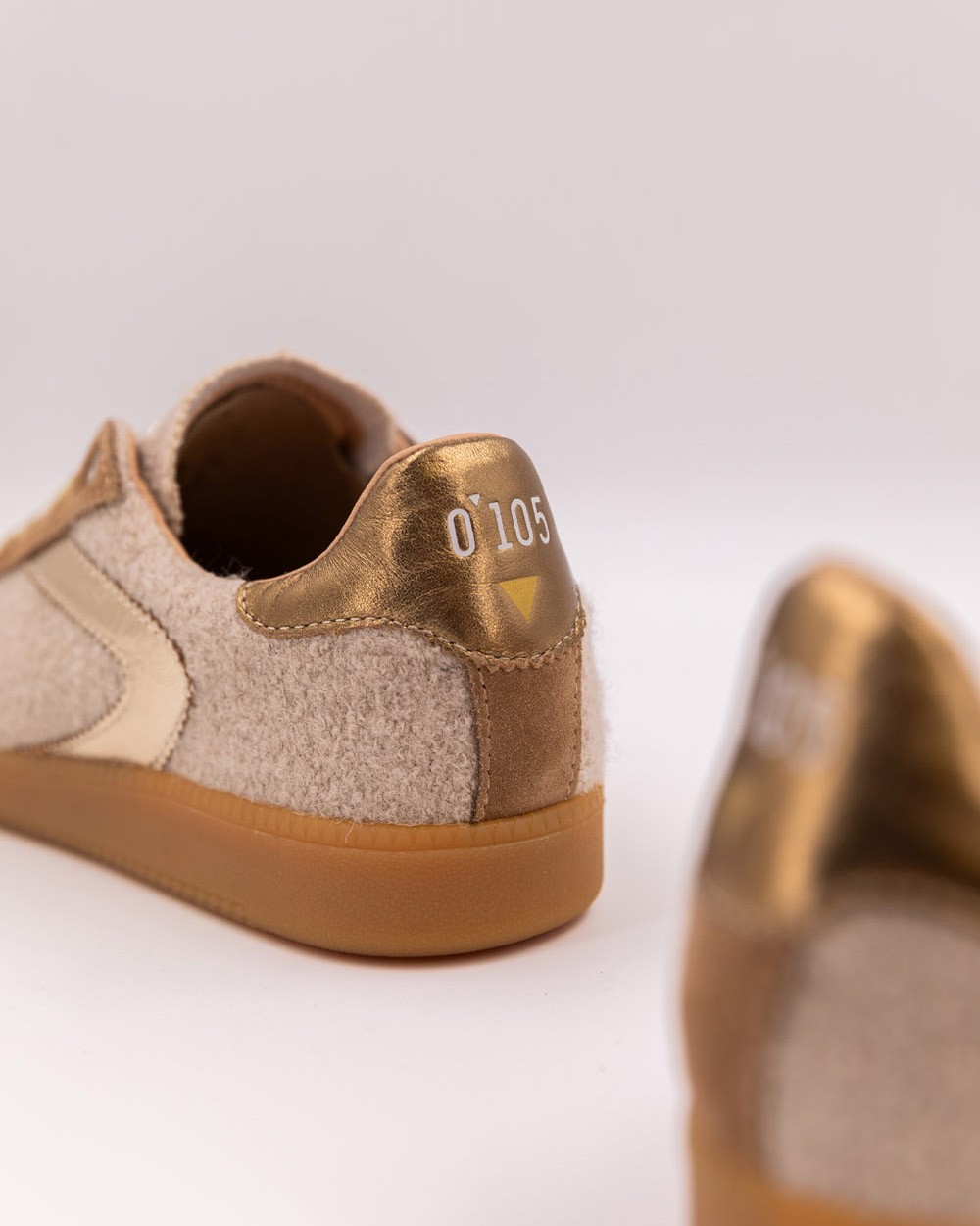 Avec sa matière effet laine qui apporte une touche chaleureuse, elle se distingue par ses détails en cuir doré et ses lacets scintillants.