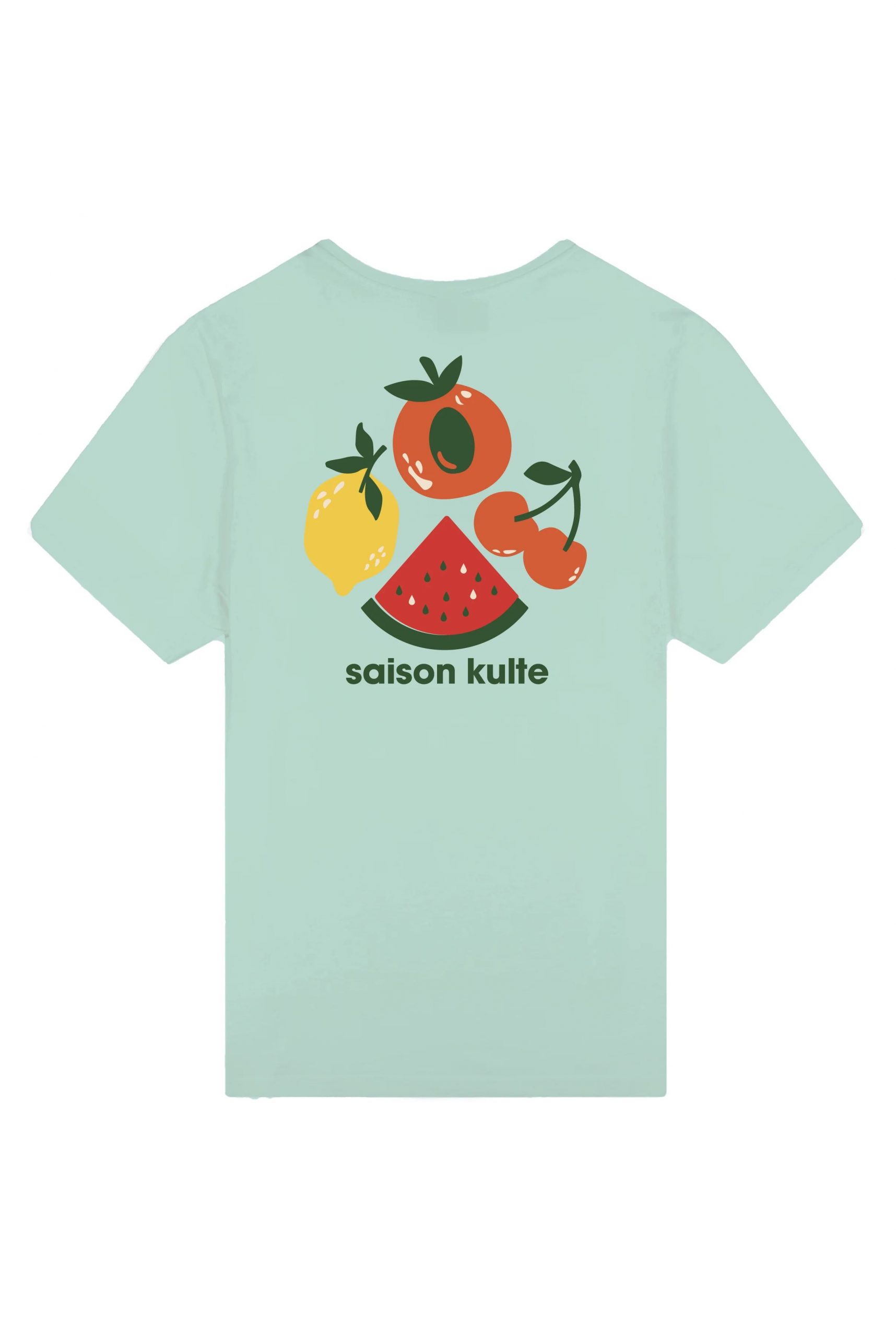 Le t-shirt Saison Kulte vert met en lumière un visuel fruité grand format dans le dos : citron, abricot, cerises et pastèque composent une illustration solaire inspirée des marchés du sud et des vacances méditerranéennes.