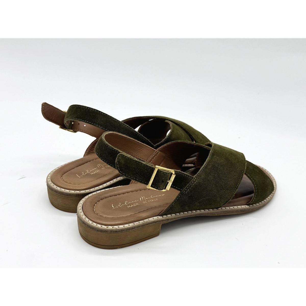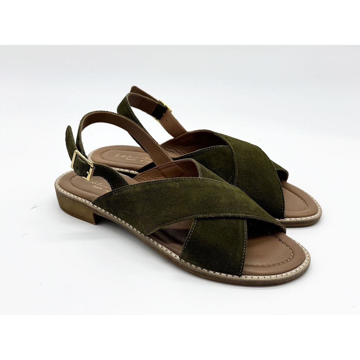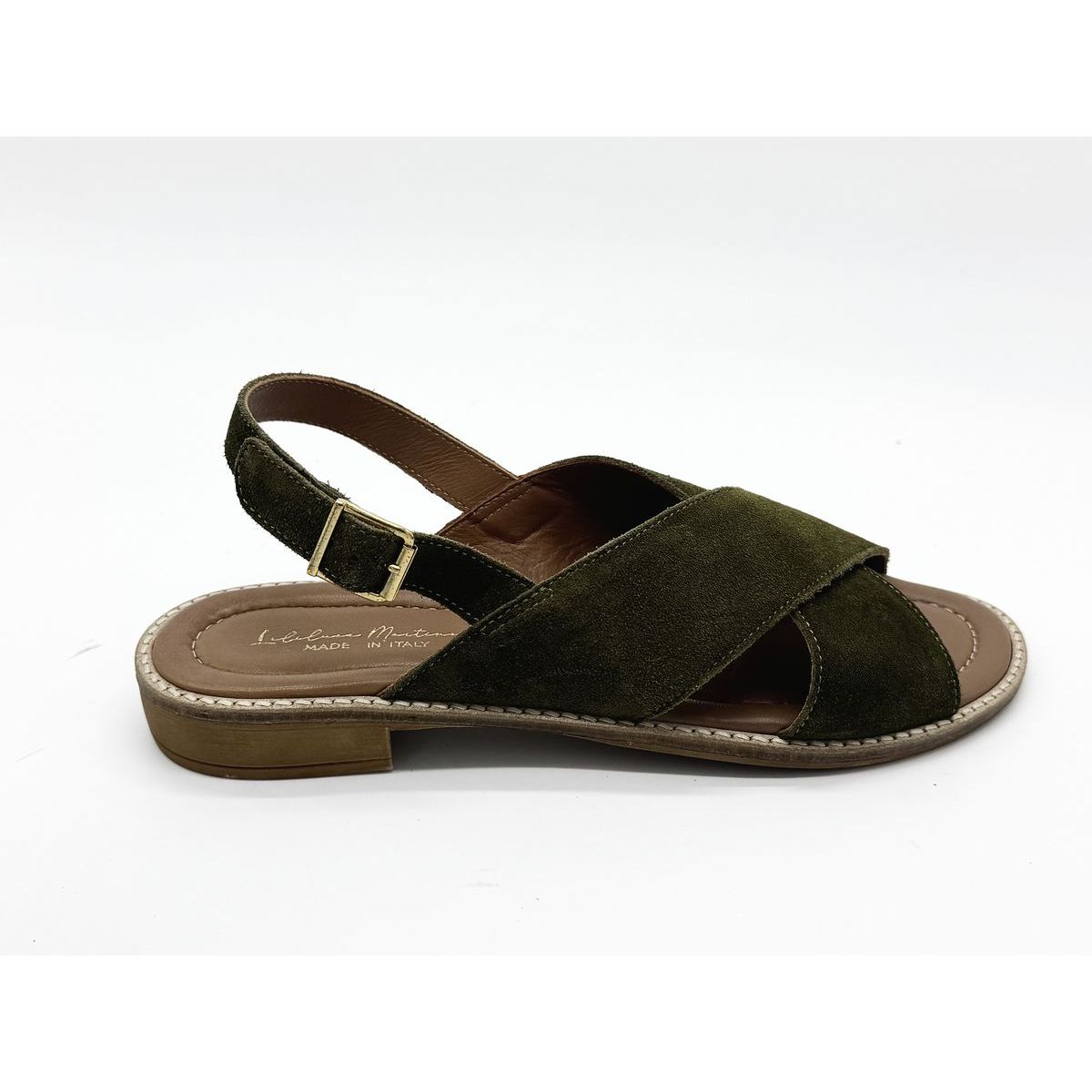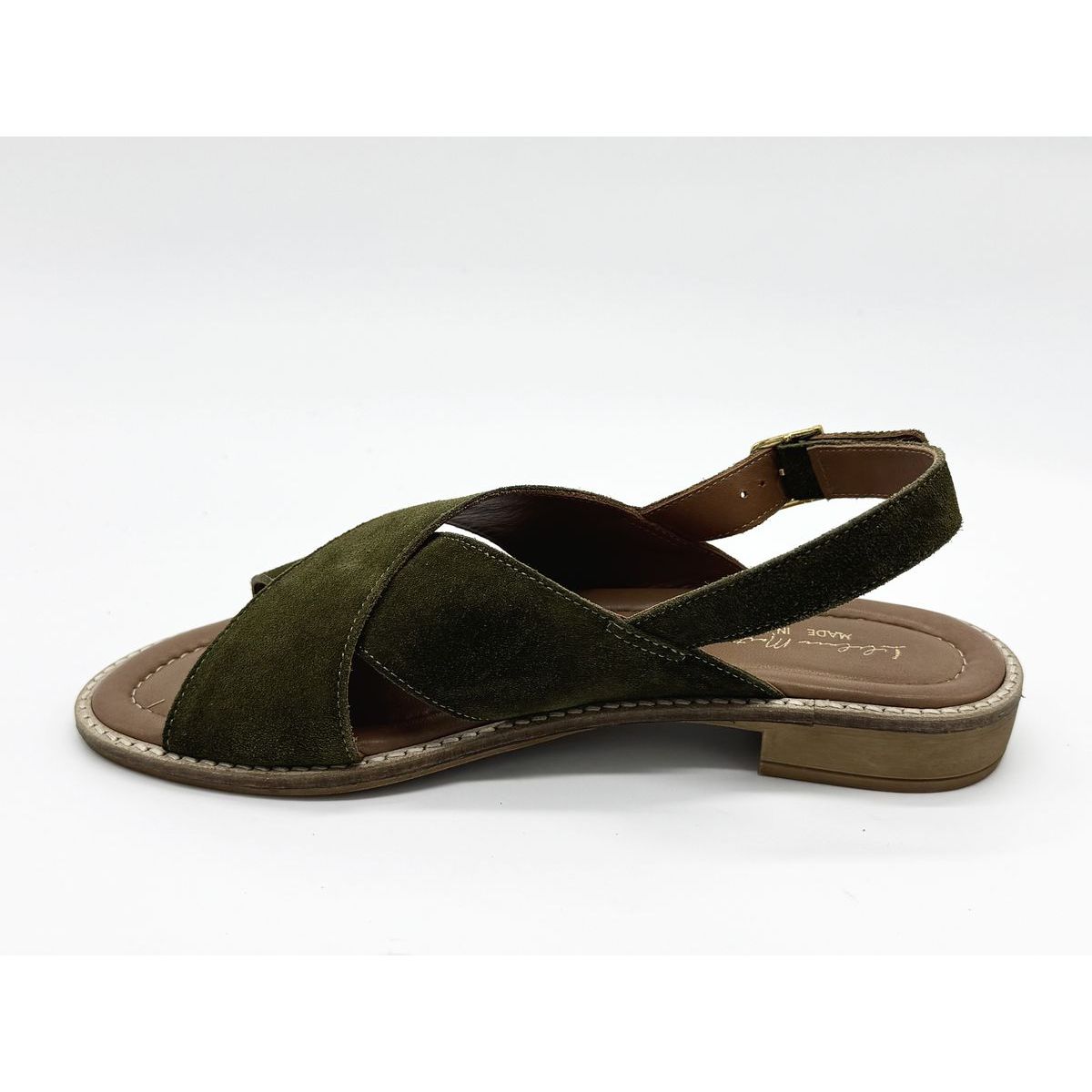 Le modèle Mika Croisé Cuir Suédé Olive de la marque marseillaise LILILUCE MARTINES est une sandale brides croisées avec une attaché à boucle