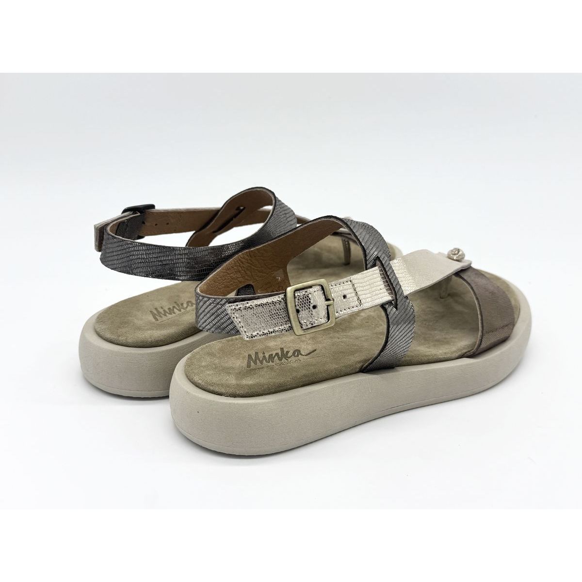 Le modèle Klara Cuir Croco Bronze Crème Acier de la marque portugaise MINKA est une sandale montée sur une plateforme de 3 cm.