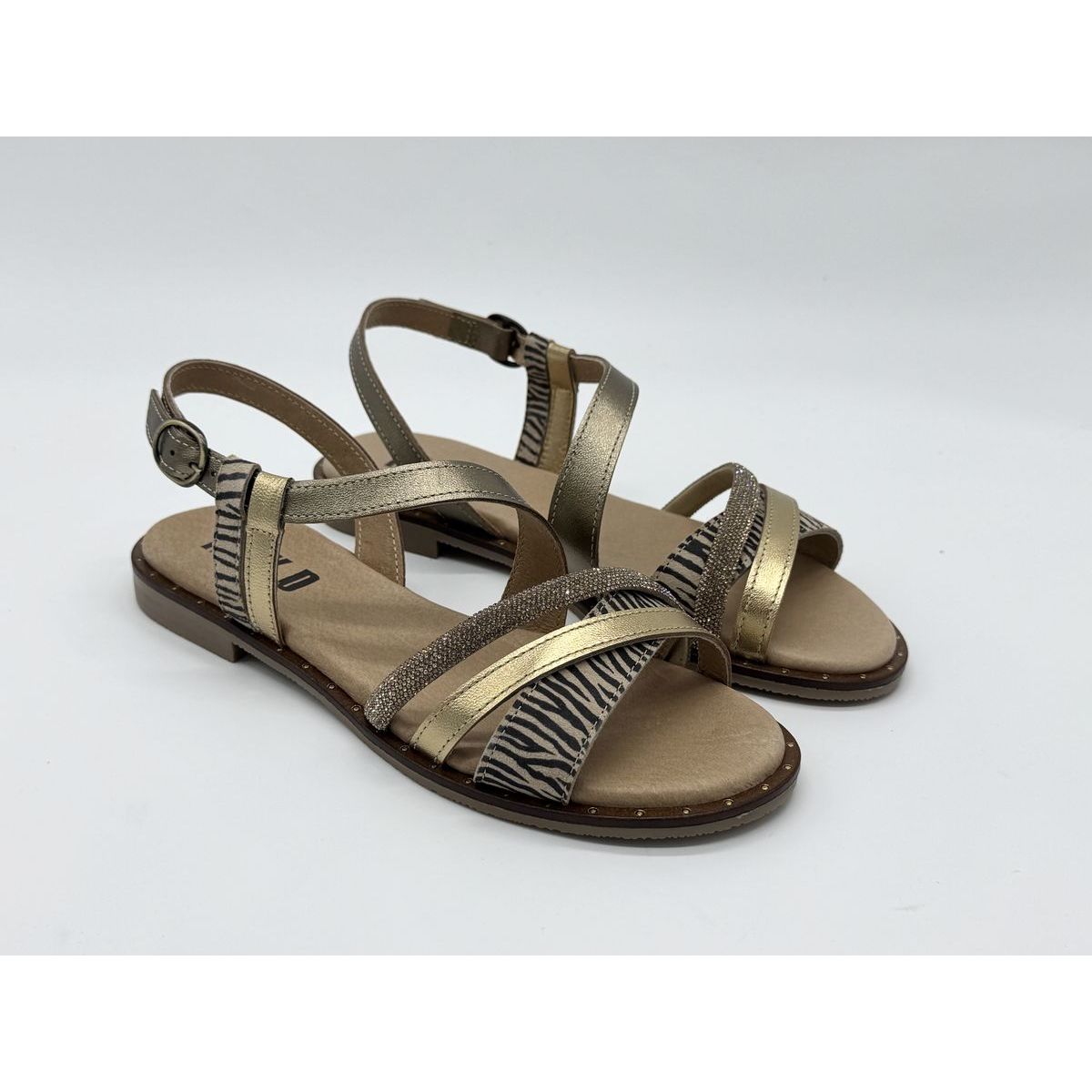 Le modèle Betanie Cuir Or Zèbre Glitter de la marque portugaise MKD est une sandale plate