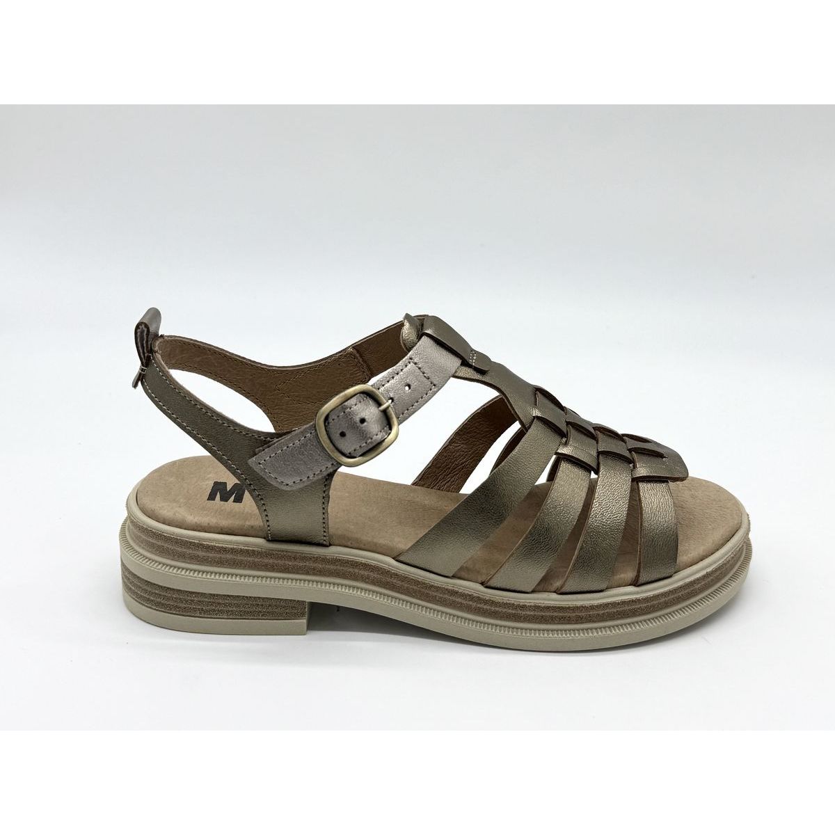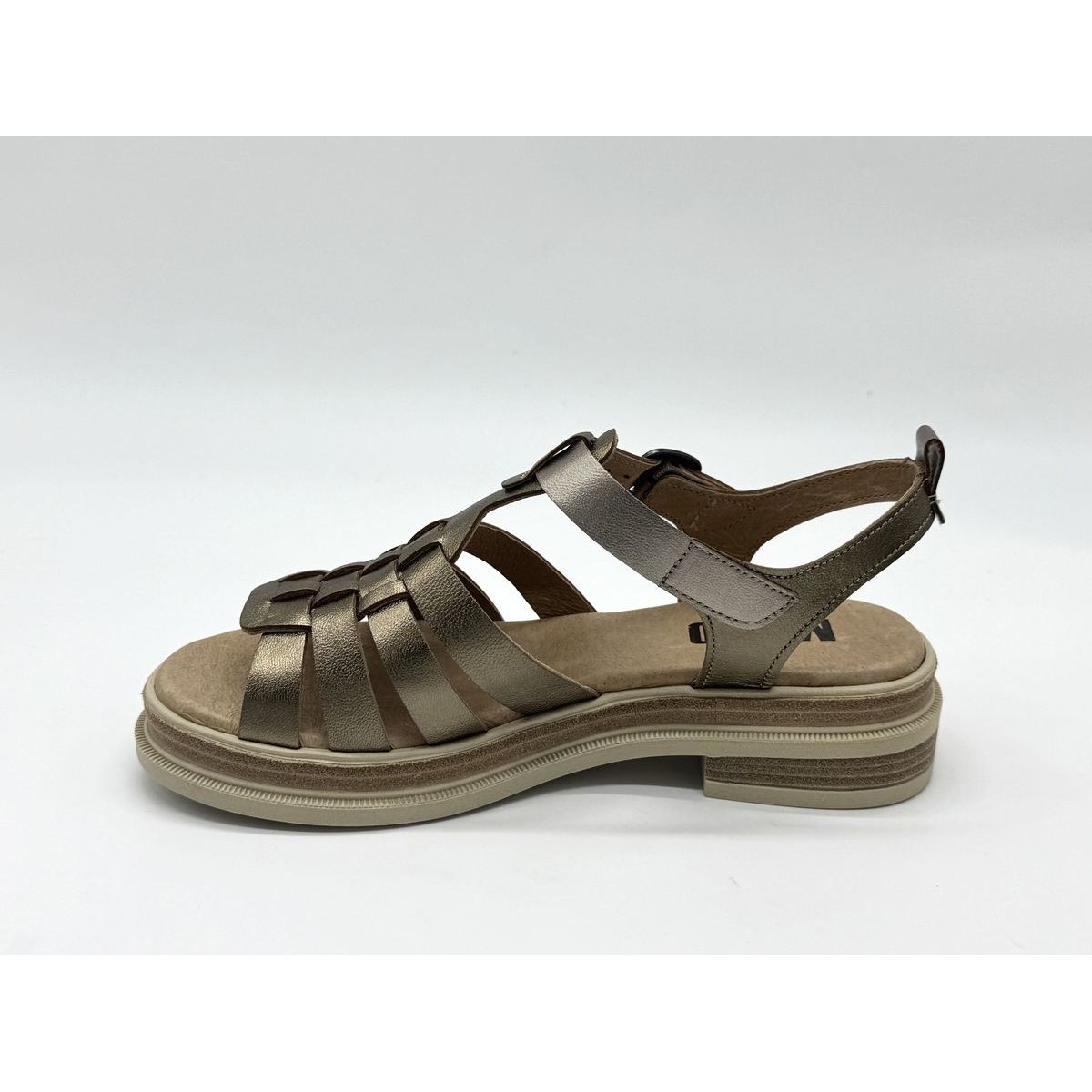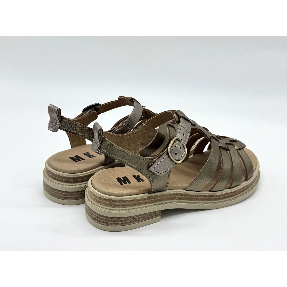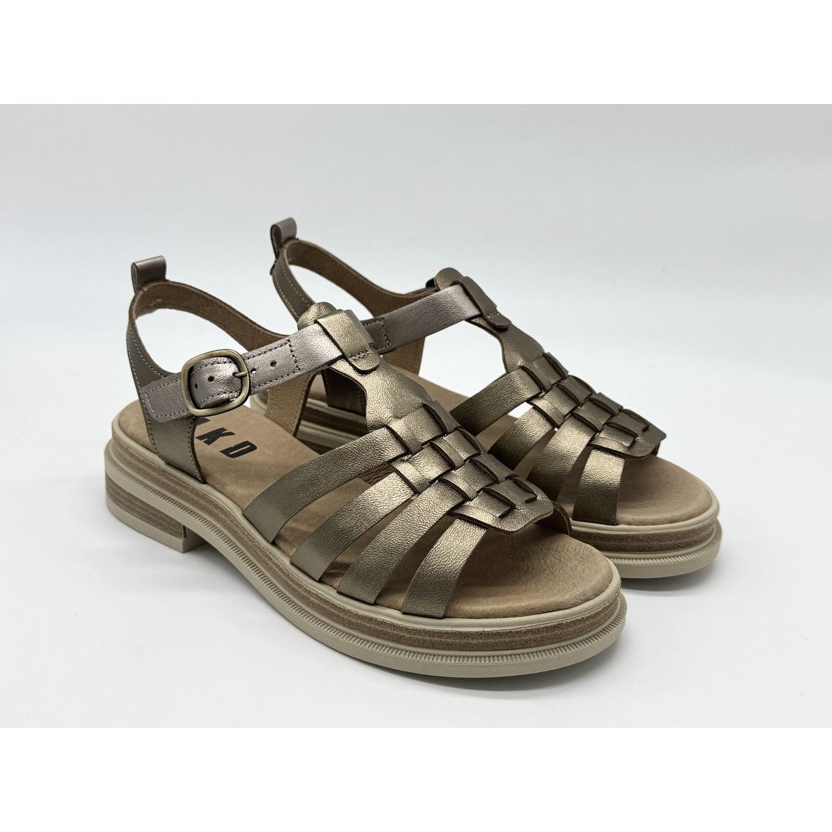 Le modèle Canelle Laminato cuivre de la marque portugaise MKD est une sandale montée sur un talon de 4 cm patin de 2.5cm.