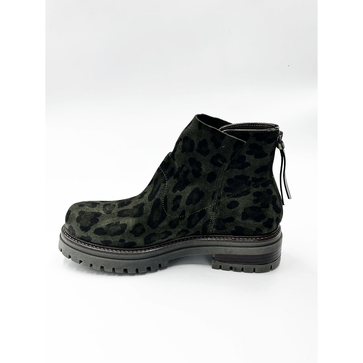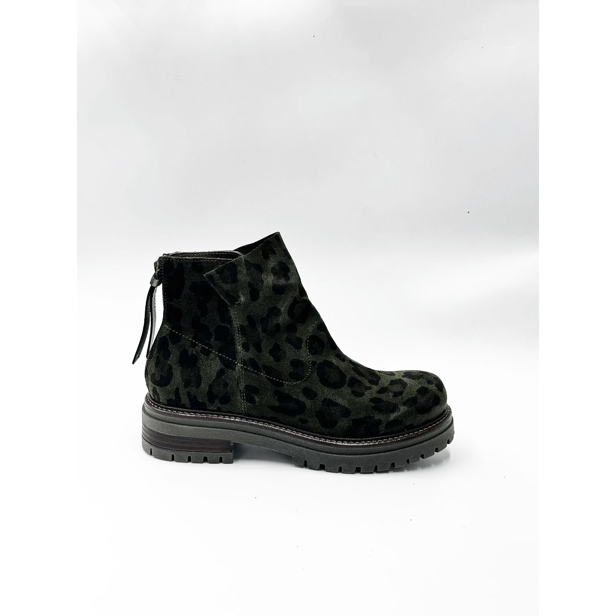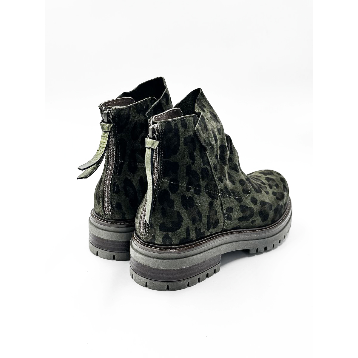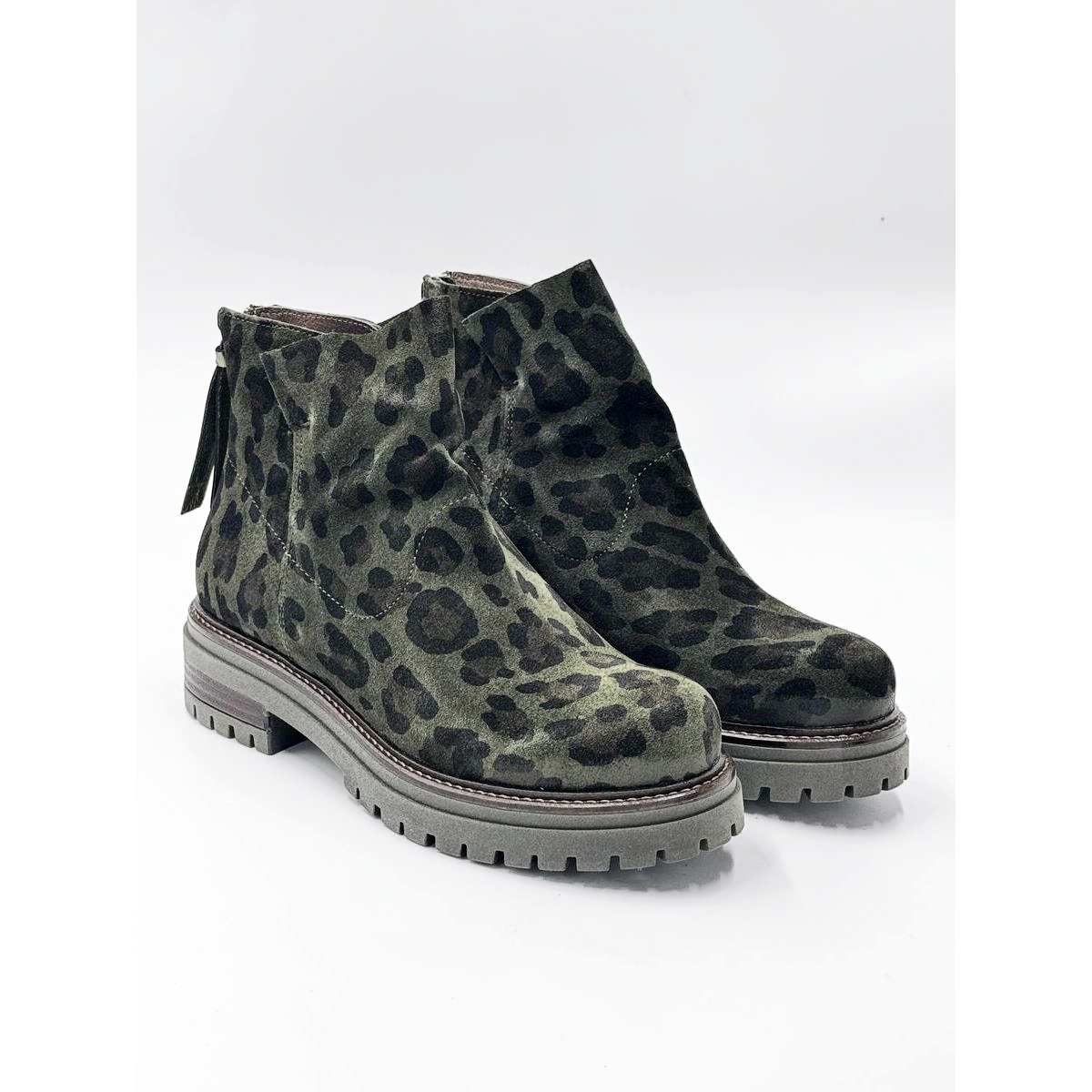 Le modèle Hamilo Léopard Kaki de la marque portugaise MINKA est une boots biker avec zip monté sur un talon de 4 cm.