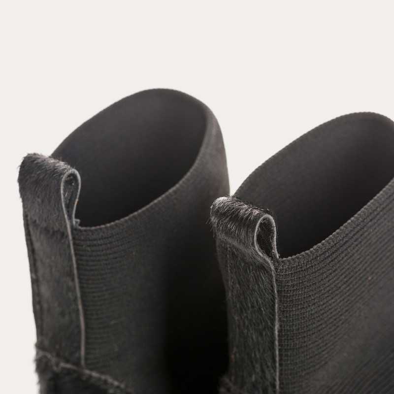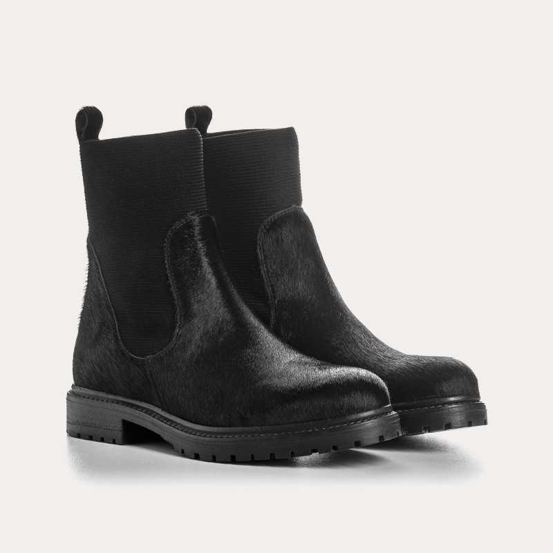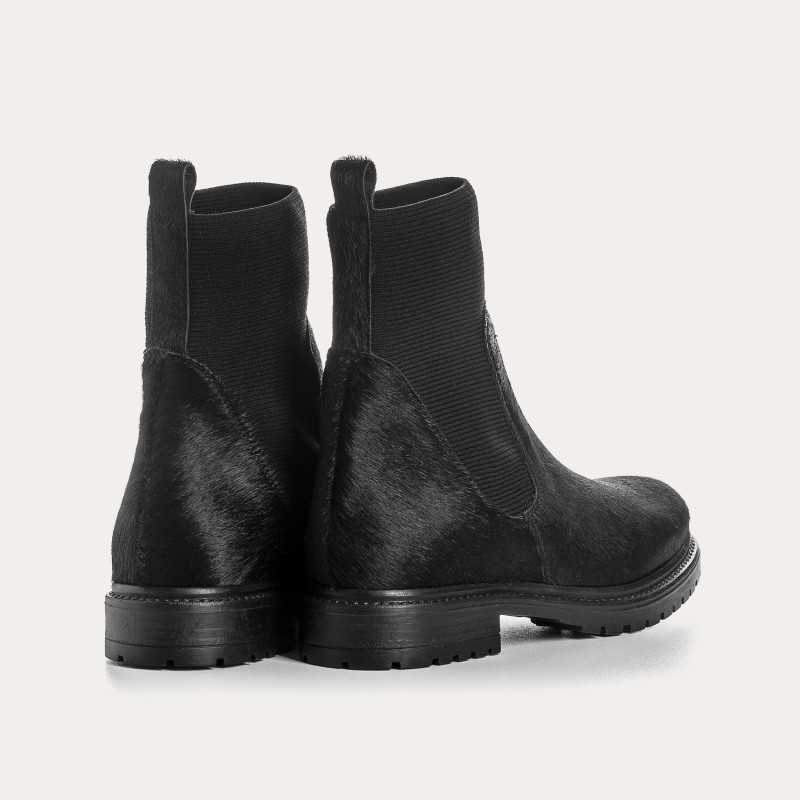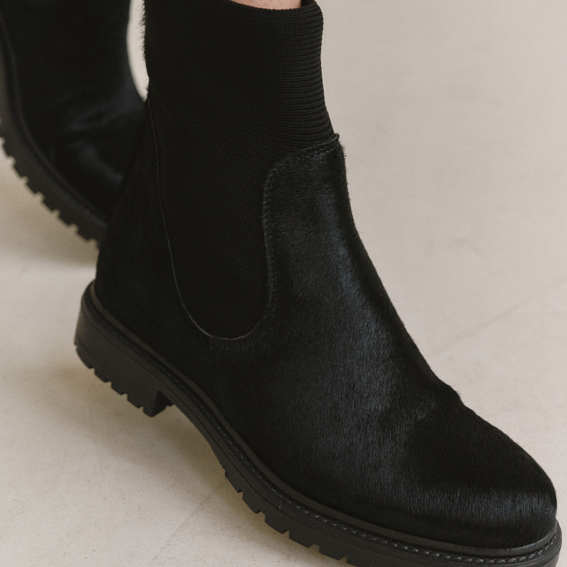 Élégantes et faciles à porter, les bottines Evelyn revisitent la chelsea boot en cuir noir effet horsy, à la texture subtile et raffinée.