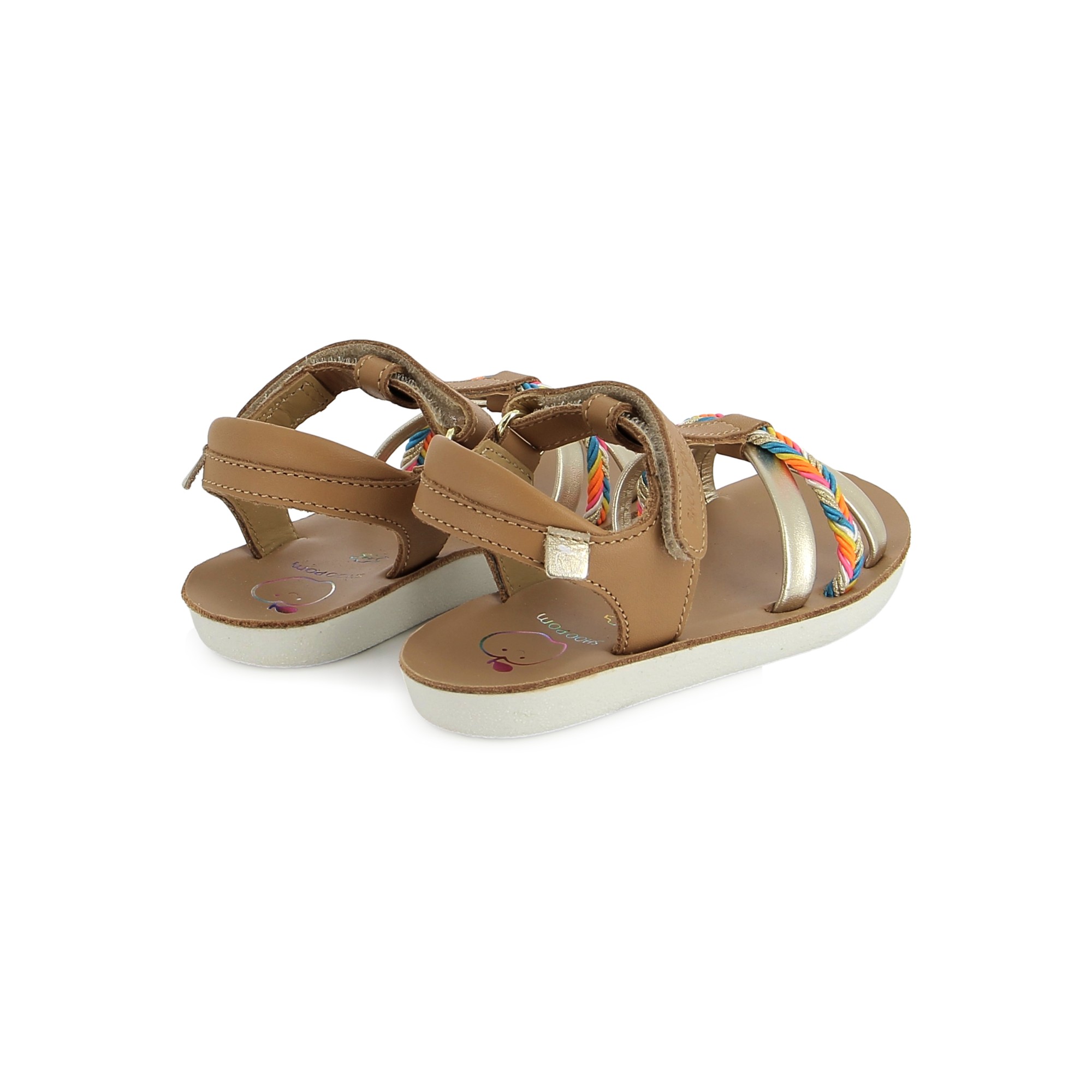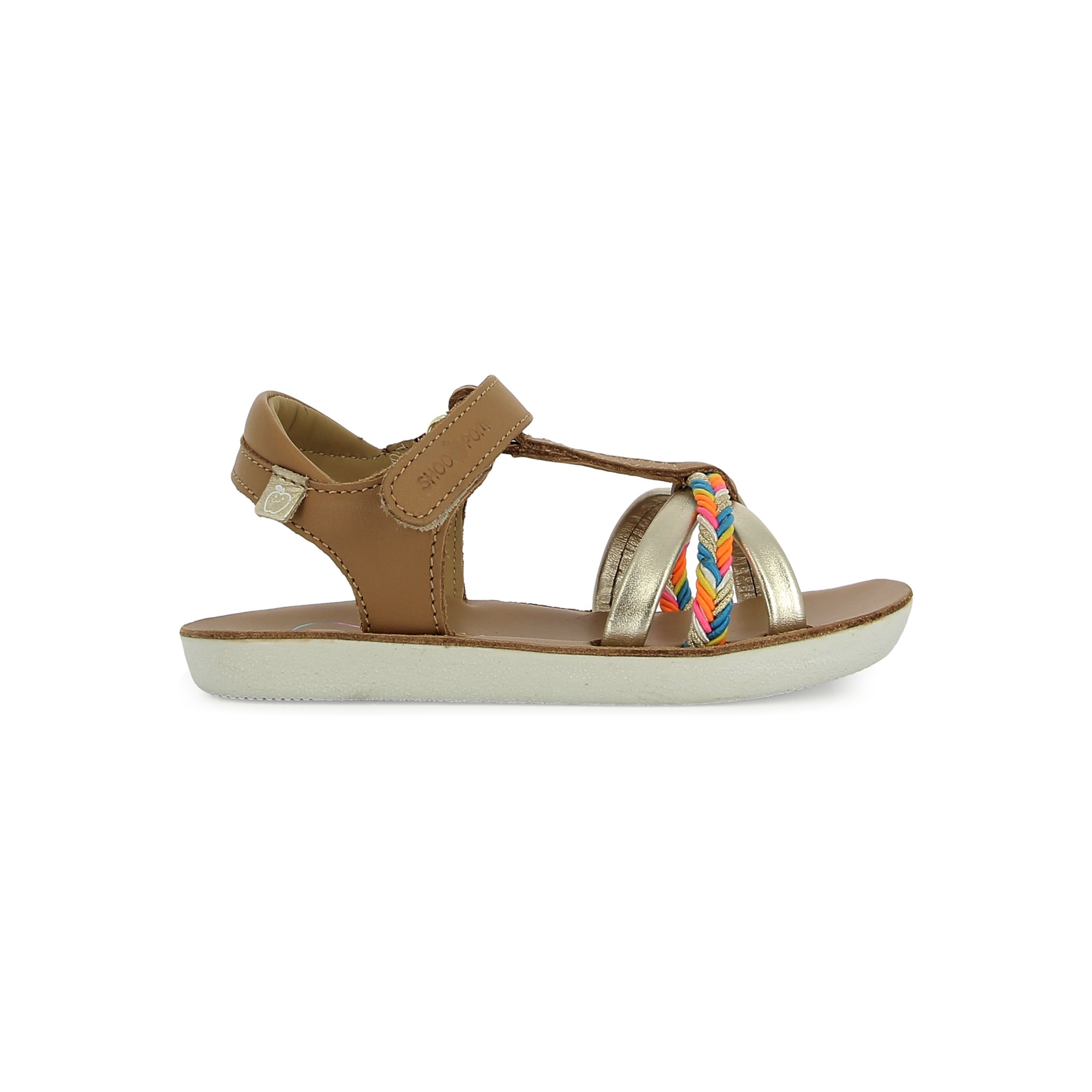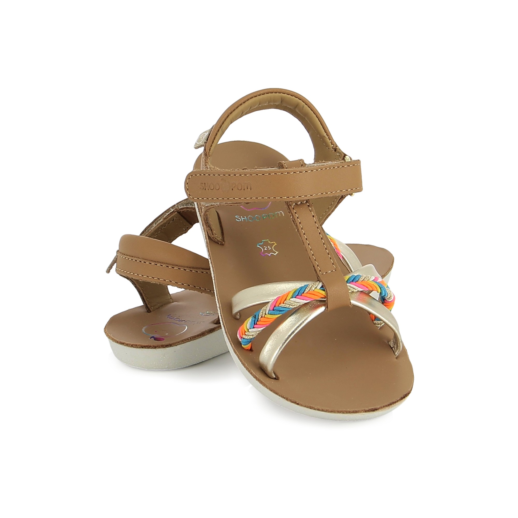 La Goa Salomé Nappa Camel Multi de la marque française SHOOPOM est une sandale pour enfant est présentée dans une version en cuir naturel avec des brides entrelacées multicolores.