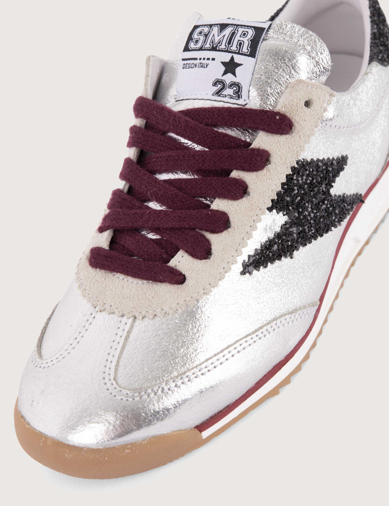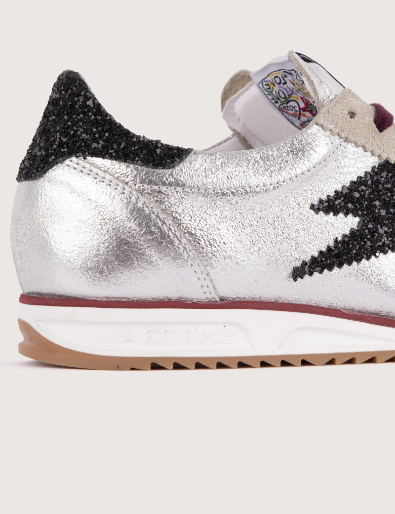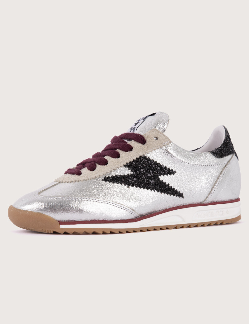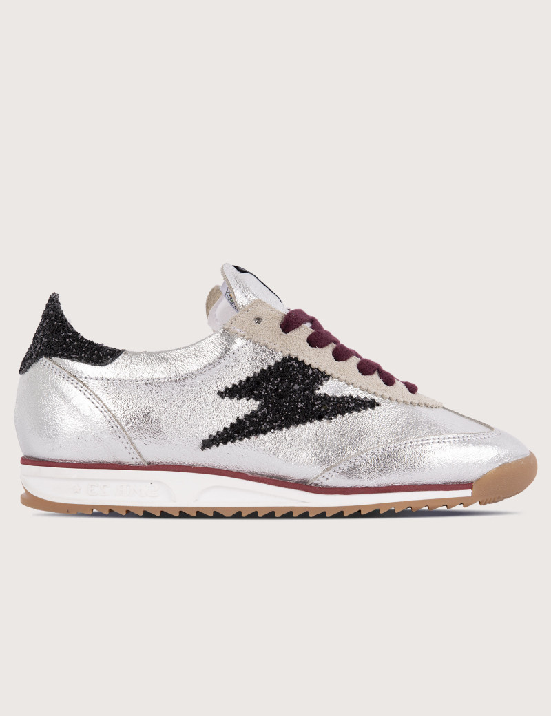 À l’arrière, un talon noir pailleté avec logo éclair affirme une touche graphique, tandis que les lacets bordeaux apportent une note de caractère.