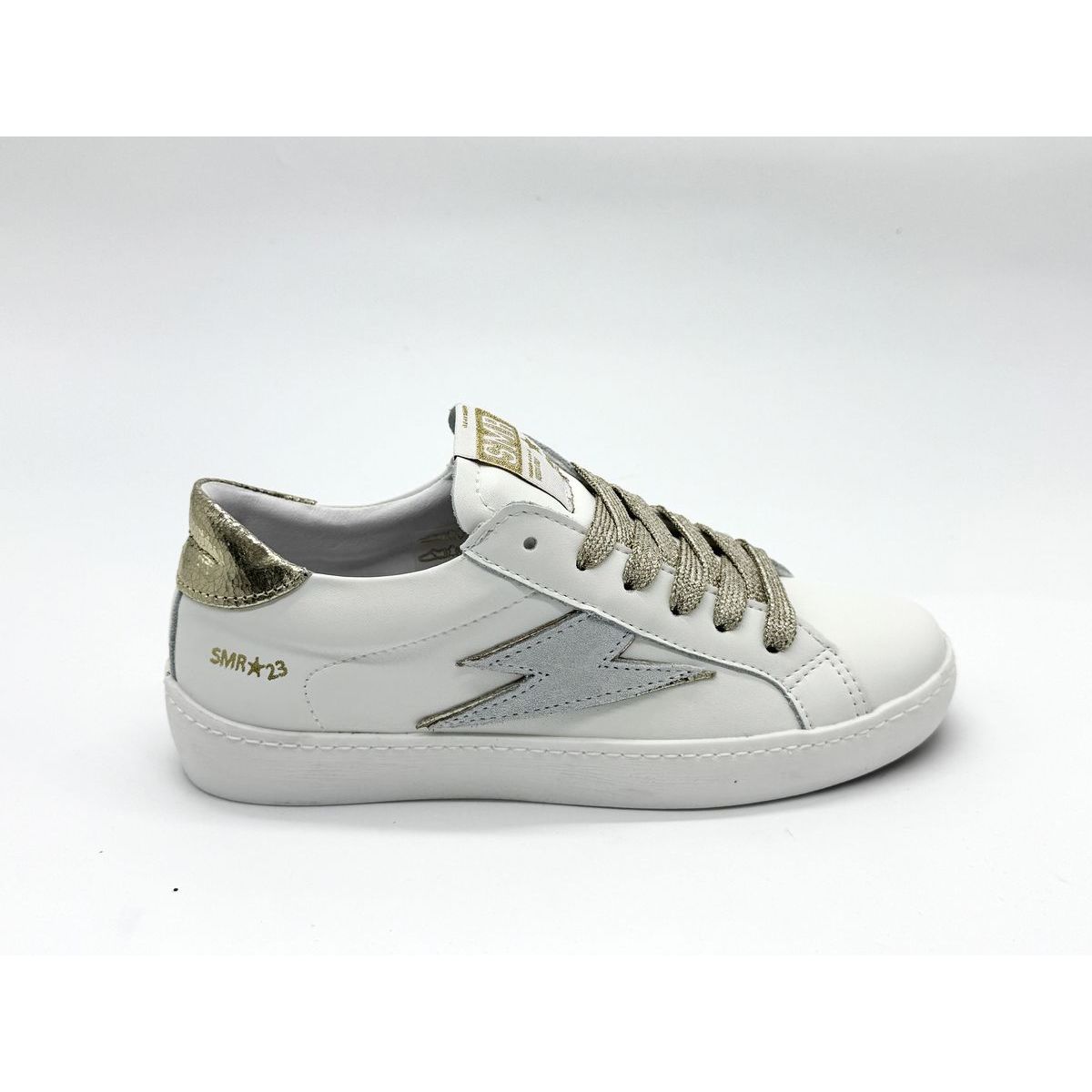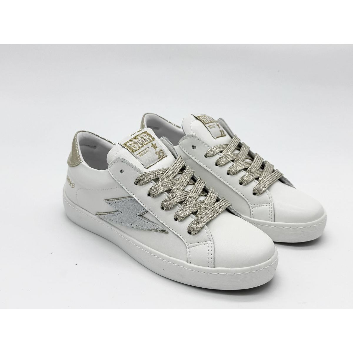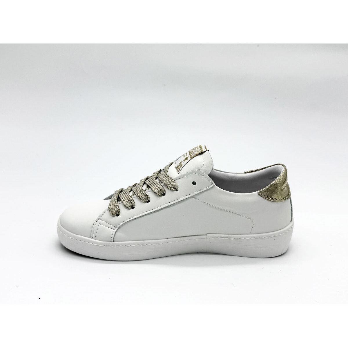La sneaker Maya D111 Blanc Gris Doré  se démarque par son design gris rehaussé de détails contrastés.