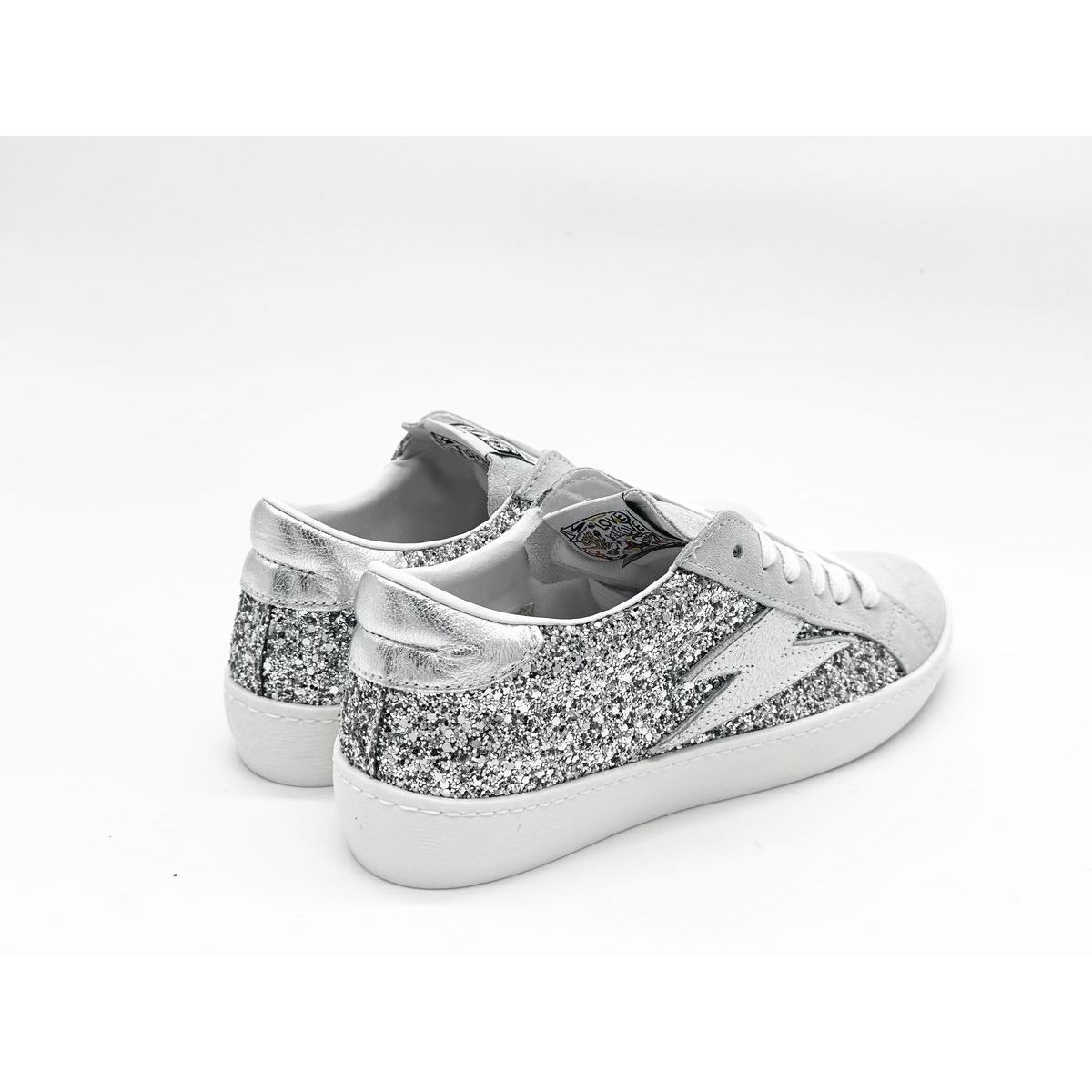 À l’arrière, un talon gris glitter avec logo éclair affirme une touche graphique.