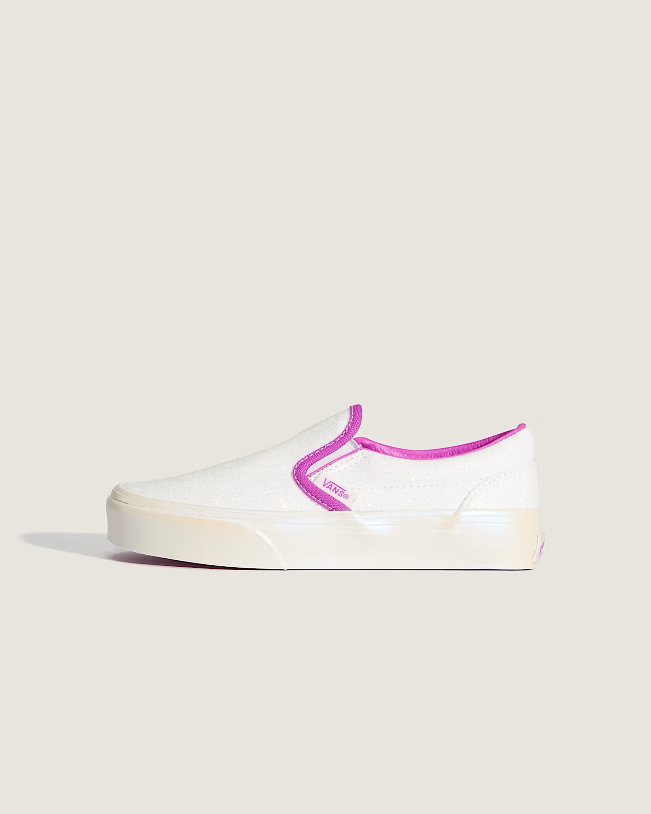 Le modèle Slip On Glitter Pearl White Purple de la marque Californienne VAN’S est un modèle incontournable qui traverse les générations.