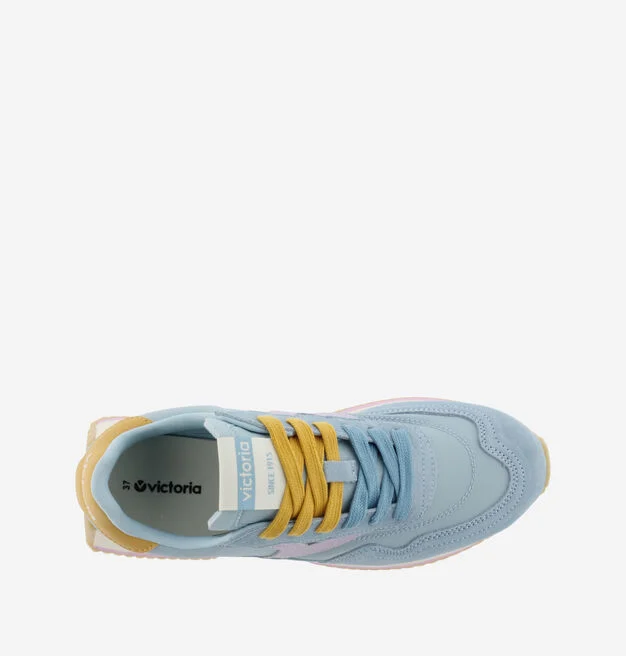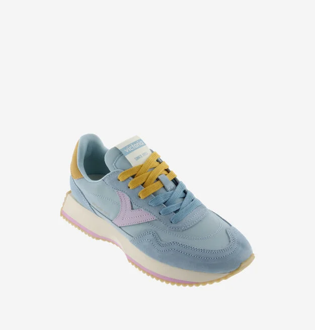 Sneakers multicolores pour femme fabriquées en nylon avec des empiècements superposés en daim ton sur ton. V latérale de victoria et pièce arrière en couleurs effet cuir. Fermeture par double lacet : un ton sur ton et un assorti à la pièce arrière. Semelle bicolore en EVA avec patin cranté en caoutchouc couleur caramel.