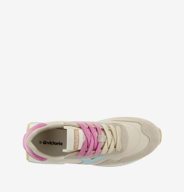 Sneakers multicolores pour femme fabriquées en nylon avec des empiècements superposés en daim ton sur ton. V latérale de victoria et pièce arrière en couleurs effet cuir. Fermeture par double lacet : un ton sur ton et un assorti à la pièce arrière. Semelle bicolore en EVA avec patin cranté en caoutchouc couleur caramel.